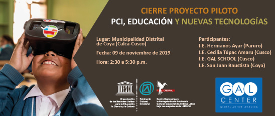 El sábado 9 de noviembre, en la Municipalidad Distrital de Coya en la Provincia de Calca, Cusco, se realizará la clausura del proyecto piloto: Patrimonio cultural inmaterial (PCI), educación y nuevas tecnologías. El evento se desarrollará de 2.30 p.m. a 5.30 p.m. y es organizado por el CRESPIAL y el Gal Center.
