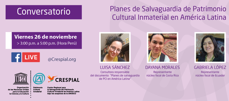 El viernes 26 de noviembre a las 3 p.m. (Hora Perú) en transmisión por Facebook Live, el CRESPIAL realizará el Conversatorio: «Planes de Salvaguardia de Patrimonio Cultural Inmaterial en América Latina» con la finalidad de compartir reflexiones sobre los Planes de Salvaguardia con una perspectiva regional, así como conocer las experiencias de Costa Rica y Ecuador con esta herramienta. El conversatorio está inspirado en el documento editado virtualmente por CRESPIAL el 2020 y disponible para su consulta y descarga libre desde el sitio web del Centro.