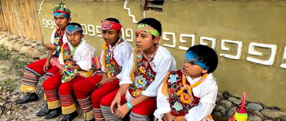 Julián relata que parte de la enseñanza es la realización de algunos elementos de su vestimenta: “Yo hice mi propio sombrero; el material original es carrizo, pero cuando lo echamos en la mochila luego no cabe, por lo que empezamos a hacerlo con tubos de PVC: los cortamos, los amarramos y ya después los cubrimos con tela y agregamos los espejos y las flores”.